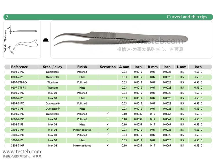 | 0203-7-PO鑷子 | Dumoxel | 0.03mm | 0.07mm | Polished拋光,全長115mm |