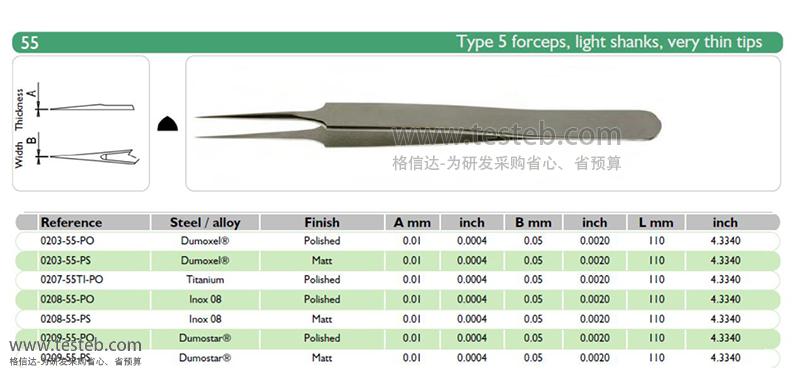 | 0209-55-PO鑷子 | Dumostar® | 0.01mm | 0.05mm | Polished拋光 |