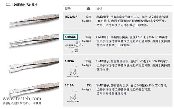 | 150SAD窄頭 | 圓形尖頭寬4mm | SMD鑷子,帶有圓形尖頭,直徑1.5-3 毫米/.059-.118英寸,齒形手指捏持區域確保使用起來安全可靠,適用于夾持圓柱形元件和微小三極管等 |