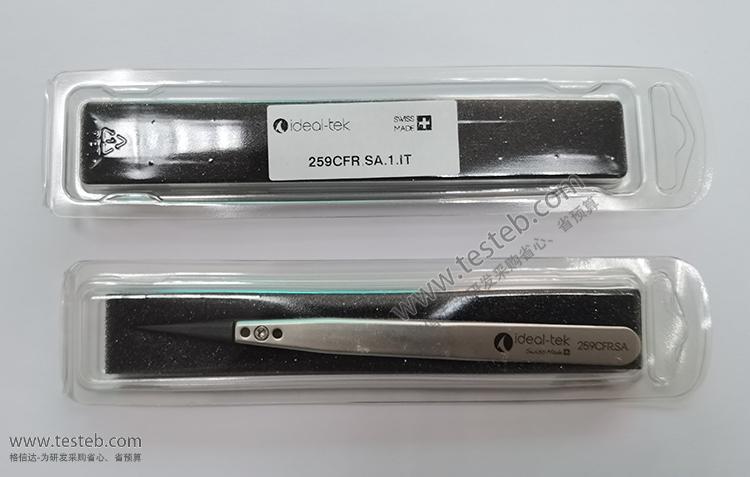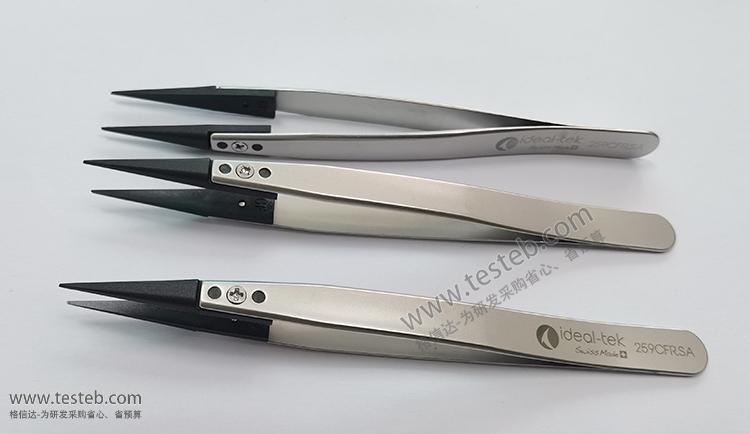 Ideal-tek 259CFR.SA鑷子采用抗磁性不銹鋼手柄,兩片可替換的碳素材質塑料鑷子頭尖部0.5mm,具有低摩擦和自潤滑性能,ESD防靜電,非常適合用來夾取敏感電子元件、芯片和陶瓷基板等物體,非磁性不銹鋼手柄,全長130mm。