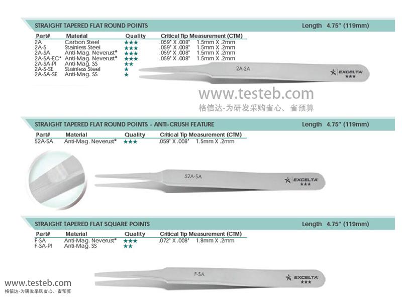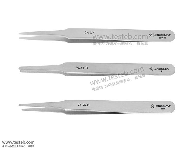 美國Excelta鑷子按照質量等級分為5星、3星、2星和1星。5等星為特殊材質及特定應用鑷子,美國Excelta品牌設計、瑞士制造Made in Switzerland,主要用途在軍工、航空航天領域;3星級為高精度精密鑷子,適用于顯微鏡5倍~10X放大條件下夾持細小物體,瑞士生產,常見為S和SA后綴型號,如EXCELTA 2A-SA鑷子;2星為低成本精密型,主要產地在意大利Italy,型號后綴PI;1等星為通用精度等級,用于不需要顯微鏡放大的常規操作應用,部分產地在巴基斯坦。