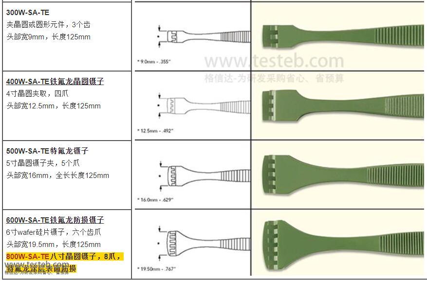瑞士Sipel 300W-SA-TE鑷子采用非磁性耐酸不銹鋼材質(zhì)制造,表面具有綠色TEFLON特氟龍涂層處理,耐酸防腐蝕,具有無痕防損性能,用于3寸晶圓硅片安全夾取轉(zhuǎn)移,頭部上端帶3個齒爪,下端具有臺階止擋,手柄帶鋸齒確保操作安全穩(wěn)固。其它規(guī)格如3寸、4寸、6寸、8寸系列晶圓鑷子,以及標準夾持應(yīng)用的平頭尖頭鑷子,均可加TE后綴訂購經(jīng)過TEFLON鐵氟龍鍍層表面處理的型號。