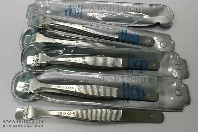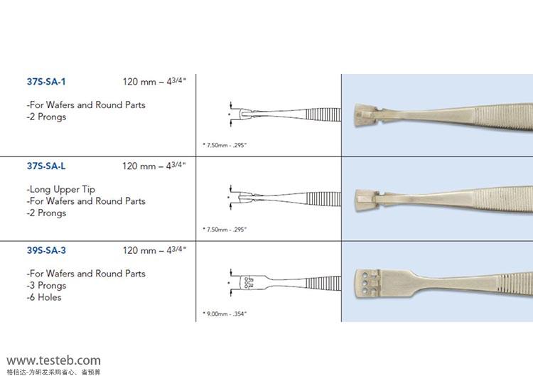 SIPEL晶圓鑷子頭部形狀分有上下平板型、上下臺階狀A、帶爪及止擋柱型E、上部臺階底板平帶限制止擋住型GB、鐵氟龍夾片型J、上頜帶爪下頜臺階止擋型W、上頜帶爪下頜臺階止擋并漏孔WG,分別針對不同類型尺寸的硅晶芯片夾取特點而設計,如夾緊程度、受力、穩固及耐高溫需求,鑷子手柄帶有鋸齒保證握持安全。Sipel 39S-SA-3鑷子用于3寸WAFER硅片夾取,頭部寬9mm,上部帶3個齒爪、底部6個圓孔,長度125mm。