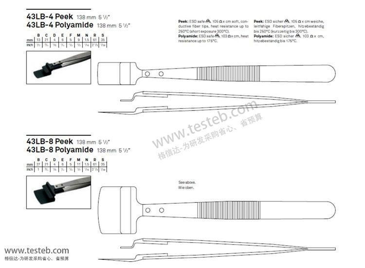 瑞比時Rubis 43LB-8-PEEK晶圓鑷子包裝及手柄印刷字樣43LB/8PEEK-SA,用于6至8寸wafer硅片夾取轉移,塑料夾頭寬27mm,內側表面拋光光滑防止Wafer劃痕損傷,ESD防靜電安全,耐化學品和耐腐蝕、耐高溫250℃,是手動夾取轉移高價值精密第三代半導體硅基晶元片的理想工具,全長138mm,非磁性不銹鋼手柄帶鋸齒握把。