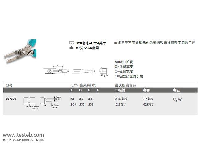 | 50789Z成形鉗 | 90度成型 | 二極管、電阻、電容 | 距元件2mm,外直角或內直角 | 適用于不同類型元件的剪切和彎折兩種不同的工藝 |
