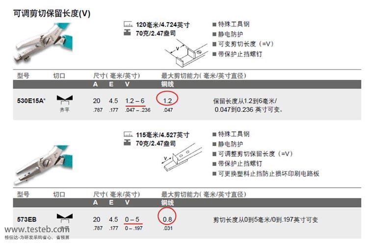 530E15A定長剪鉗可調長度1.2mm~6mm,剪徑1.2mm、573EB定長剪鉗0~5mm可調保留長度,剪徑0.8mm