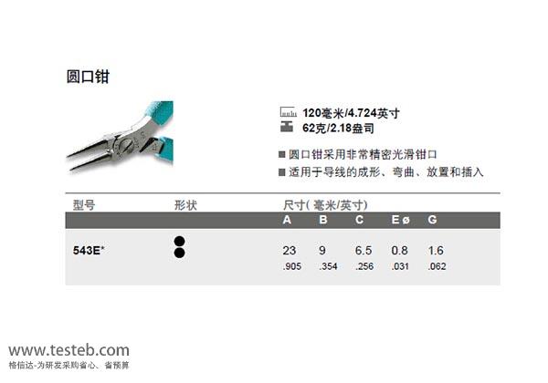 | 543E圓口鉗 | 23mm | 9mm | 6.5mm | 0.8mm | 1.6mm | 120毫米,62克 | 非常精密光滑鉗口,適用于導線的成形、彎曲、放置和插入 |