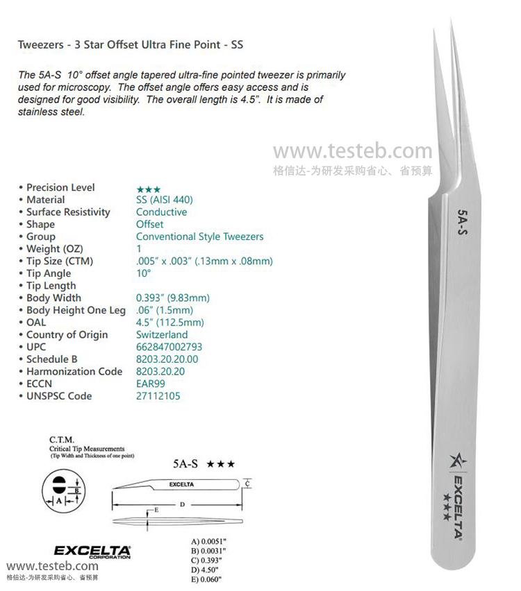 Excelta 5A-S鑷子采用Stainless steel馬氏體高碳不銹鋼(編號AISI 440),具有59HRC高硬度,比5A-SA低碳鋼款更堅硬并兼具一定的耐腐蝕性,3星高精度等級,0.13mm微彎尖頭便于操作時觀察,可在5X到10倍放大顯微鏡操作,耐高溫300℃,用于半導體和微電子組裝焊接芯片或夾持探針。