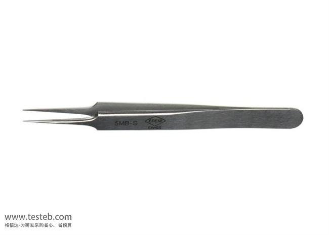 進口瑞士Weller-Erem 5MBS鑷子尖頭非常細,約0.03x0.07毫米,5號款式外形,馬氏體高碳不銹鋼材質硬度59HRC,用于在顯微鏡下夾取微芯片、生物實驗細胞夾操作、美容挑黑頭等精細應用,長度115mm,重量12g。