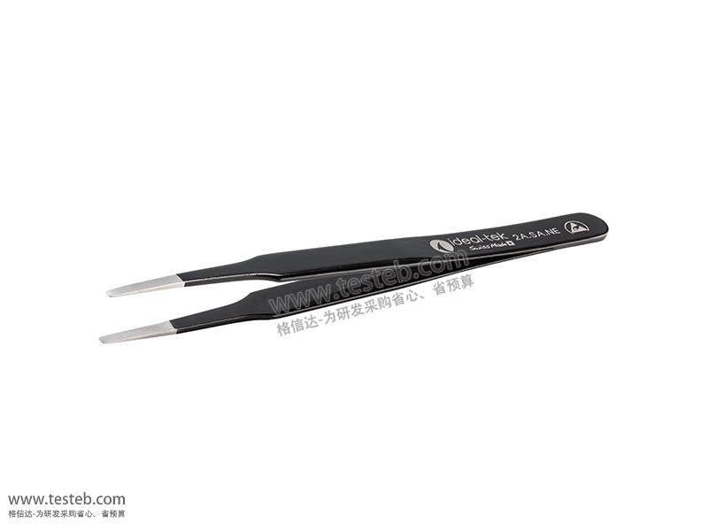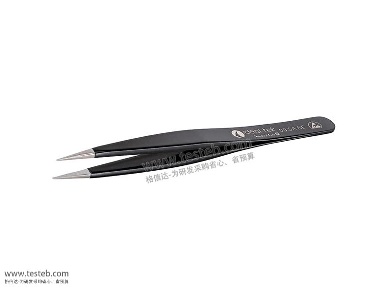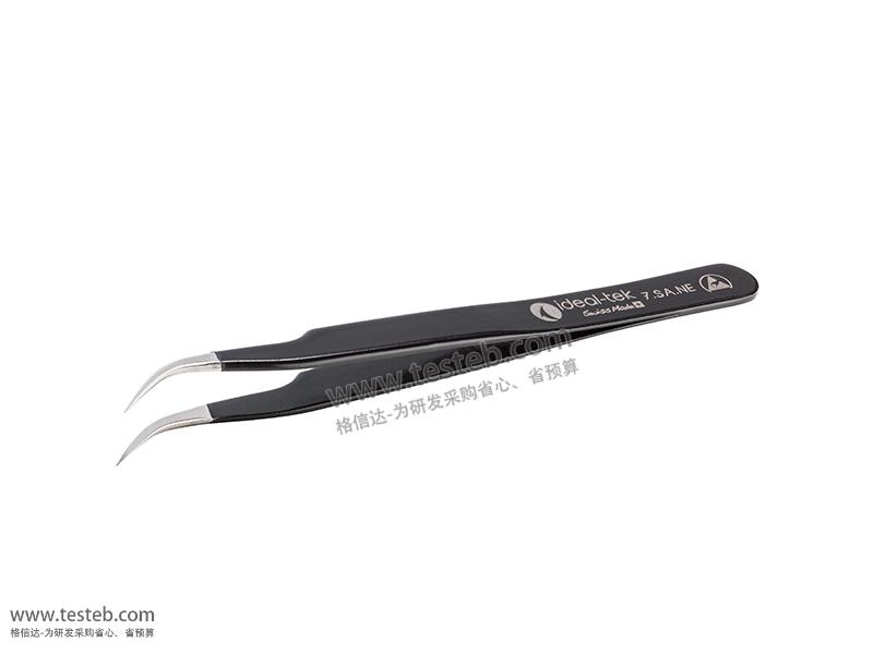 ideal-tek 7.SA.NE彎頭鑷子尖部寬度0.3mm,低碳奧氏體不銹鋼材質具有非磁性、耐酸耐熱特性,表面鍍上一層黑色環氧樹脂涂層使其符合ESD防靜電和潔凈室操作要求,鷹嘴狀彎頭可穩固夾持并具有良好的操作視野,適用于微電子元件夾取組裝等精密操作,Swiss Made瑞士制造。