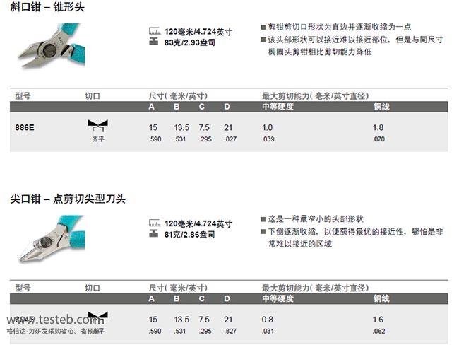 | 886E斜口鉗 | 錐形頭 | 齊平 | 15mm | 13.5mm | 7.5mm | 21mm | 1.0mm | 1.8mm | 剪鉗剪切口逐漸收縮為一點,可以接近難以接近部位 |