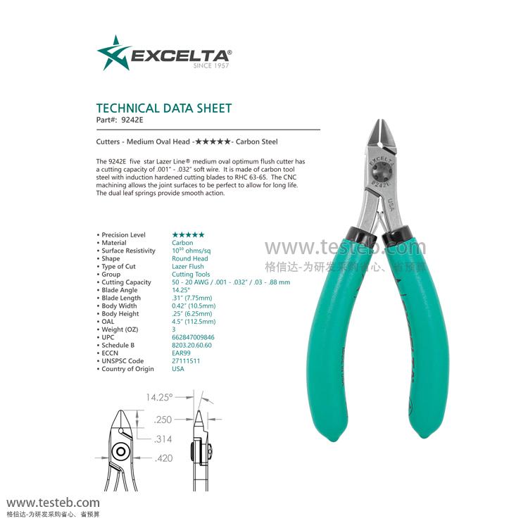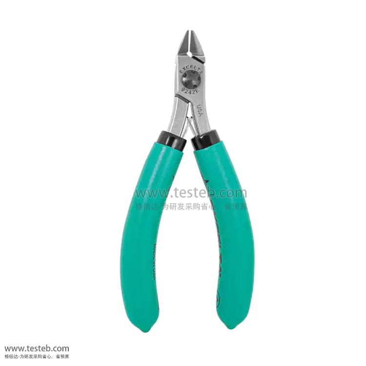 美國EXCELTA 9242E斜口鉗采用中等橢圓形鉗頭設計,剪徑0.8mm,超齊平切口僅留下很小的夾痕,兼具堅固性和精密性,質量等級5五星,Double-Dip雙色泡沫手柄,ESD防靜電,鉗子全長115mm。