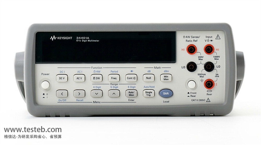 Agilent 34401A是全球最暢銷的臺式數字多用表DMM,具有1000V最大輸入電壓,3A最大輸入電流,6½位分辨率,基礎精度:0.0035%直流,0.06%交流。安捷倫更名是德科技Keysight 34401A數字萬用表10種測量功能:直流/交流電壓、直流/交流電流、2線和4線電阻、二極管、導通、頻率、周期。安捷倫數字萬用表34401A 6 1/2位數字萬用表1000 個讀數/秒,存儲器可存儲 512M 讀數。