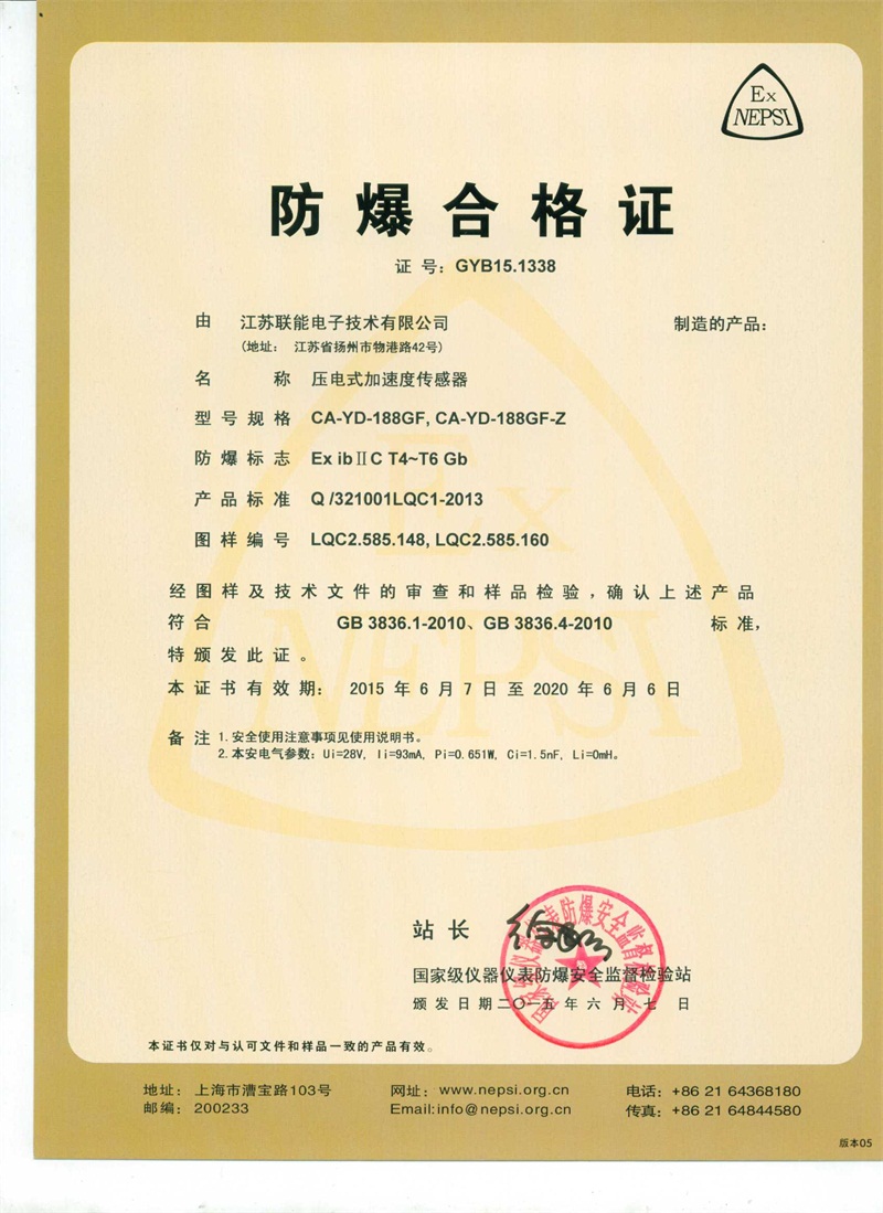 188GF壓電式速度傳感器防爆標志ExibIICT4/T6 Gb 國家級儀器儀表防爆安全監督檢查站認證頒發防爆合格證書 |