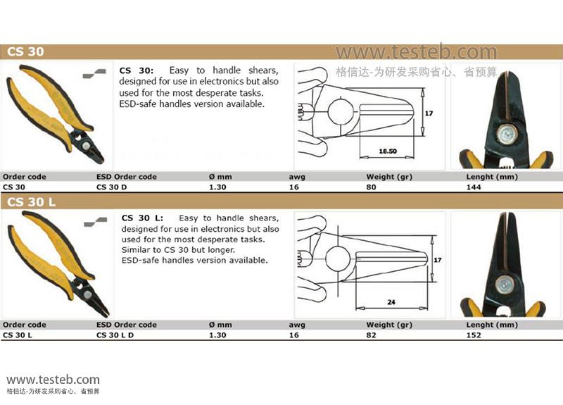 皮爾杰克PIERGIACOMI CS-30剪刀鉗刀刃長度18.5mm,鉗子全長144mm、重量80g,用于剪切塑料、橡膠及1.3mm線徑以內電子軟線。Piergiacomi CS 30: Easy to handle shears, designed for use in electronics but also used for the most desperate tasks. ESD-safe handles version available——CS 30 ESD。