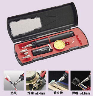 烙鐵焊嘴(焊嘴溫度580℃)兩種類型: φ1mm、2.4mm。用于印刷電路板、通信線路、彩色玻璃、模型、車輛、船舶、天線等的修理。 熱風/熱風器(溫度625℃):導線固定用塑管的熱收縮固定、膏狀焊錫印刷等。