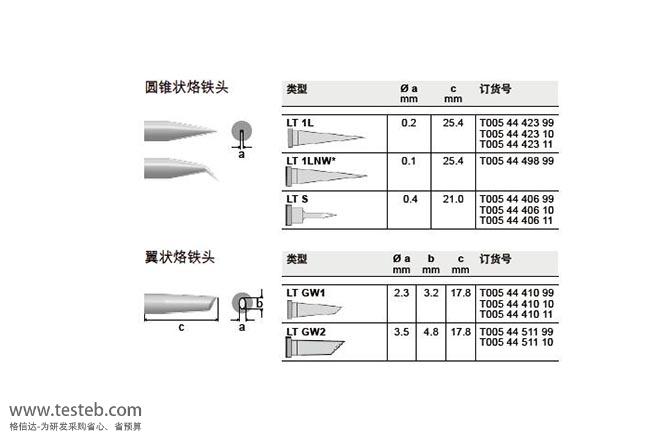 WELLER烙鐵頭LT銀線發熱系列用于WP 80、WSP 80電烙鐵,MPR 80,FE 75,TCP-焊筆,LR 21,烙鐵咀使用材料少,成本低。LT系列烙鐵頭用于各種 SMD & THT應用,適用于小或大的熱需求量,具有高效的熱量傳遞,可快速的溫升與回溫。Weller LTGW烙鐵頭為馬蹄形內凹形焊咀,工作面寬2.3mm,容錫槽寬1.4mm,LTGW2翼狀工作面寬4.0mm,容錫槽寬3.5mm。