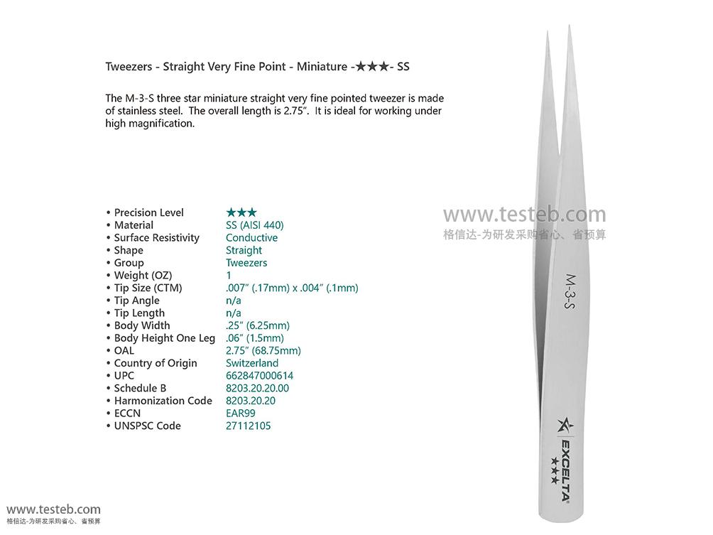 Excelta M-3-S鑷子尖頭0.17mmx0.1mm,總長度69mm,適用于5倍~10X顯微鏡放大條件下夾持細小物體精細操作,馬氏體高碳不銹鋼材質制作具有59HRC高硬度,耐高溫300℃,Swiss MADE瑞士制造。M-3-S鑷子規格文檔http://m.jwjzzs.com/download/202302/Excelta_M-3-S_Datasheet.pdf