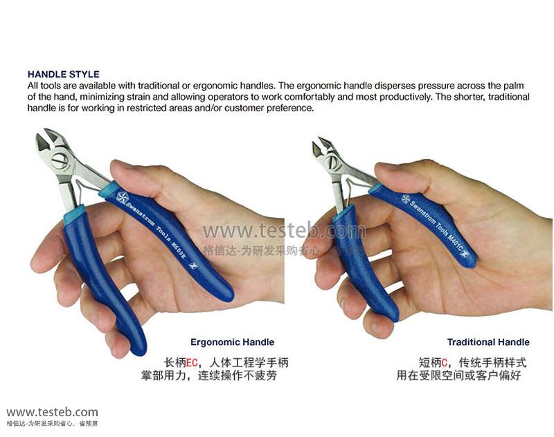 可調節的scrivet™螺紋接頭系統,18-21 RMS表面處理和3位可調開啟止動裝置可減少操作員的疲勞,并有助于確保對各種具有挑戰性的材料進行精確一致的切割。鉗口呈錐形,以確保獲得優良的接近性,可在狹窄的空間操作。美國Swanstrom Tools Medical Grade Cutters醫療剪鉗比普通斜口鉗具需要更小的剪切壓力,并且在切割末端部位上留下完全齊平Full Flush斷面和極小的夾痕——對應大線徑的硬線處理通常只能實現半齊平斷面效果,如M4011C剪鉗。Swanstrom M4011C合金剪鉗Small Carbide Tapered Semi Flush Cutter尖錐頭半齊平剪切,a more robust cutting edge for heavier duty applications,更堅固厚實的刀刃,重型剪切剪徑0.6mm-1mm硬線。