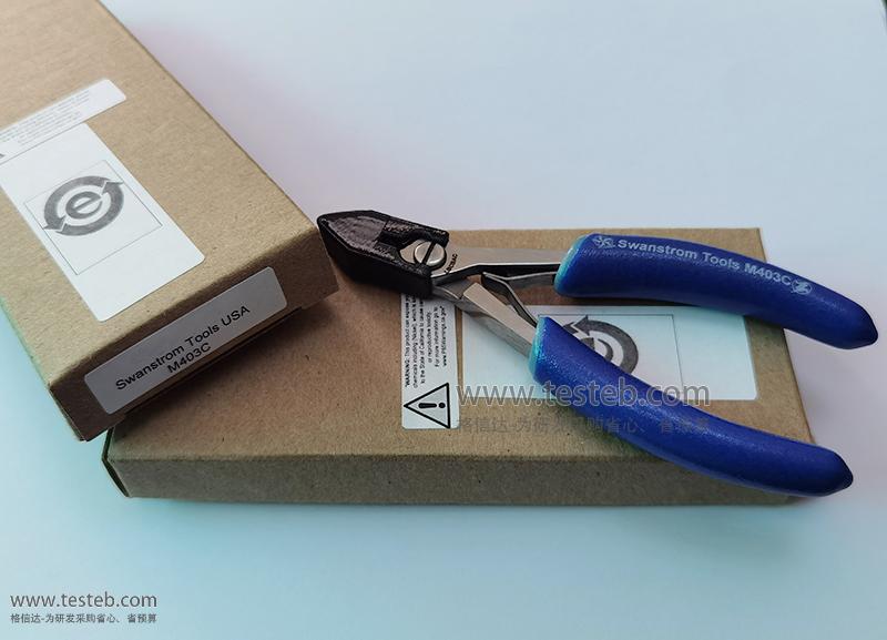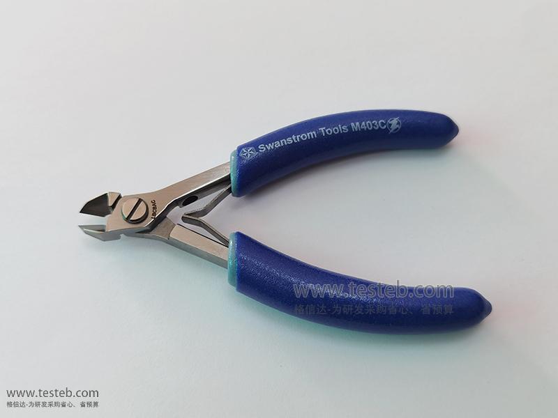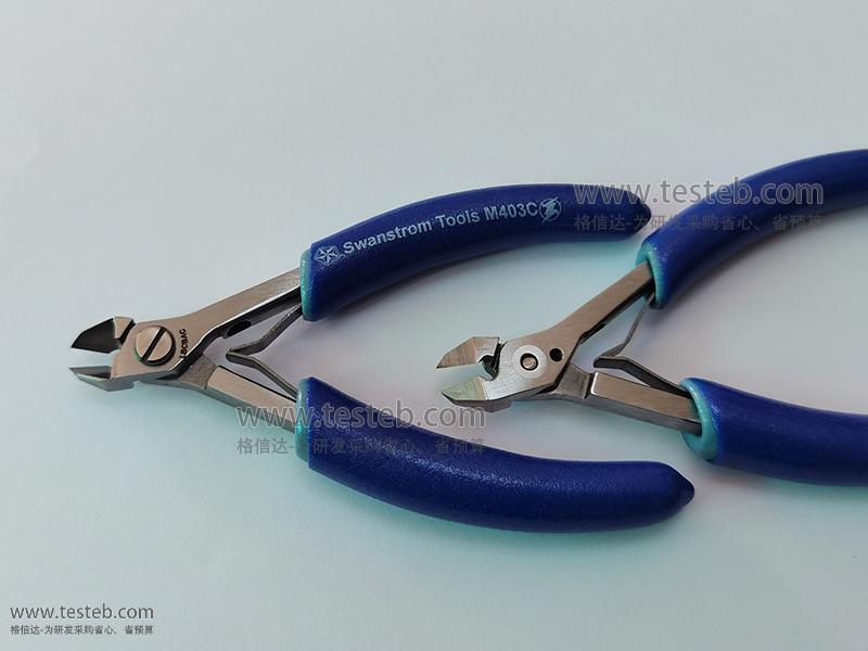 Swanstrom M403C剪鉗型號具有錐形尖頭,硬質合金切刀口,尖部厚度僅為1毫米,用于18AWG線規/1.0mm線徑銅軟線、0.5mm粗中等硬度線長、0.016"英寸/0.4mm硬線材質剪切,切口完全齊平。Small Carbide Tapered Fine Tip Diag Cutter Full-Flush。ESD防靜電雙層藍色手柄,鉗子全長120mm。