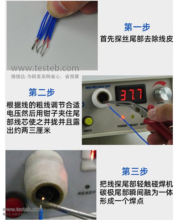 插上電焊鉗,戴上防護眼鏡,夾住要焊的兩根裸熱電偶線,最后把夾好的熱電偶線往焊接電極上碰進行焊接