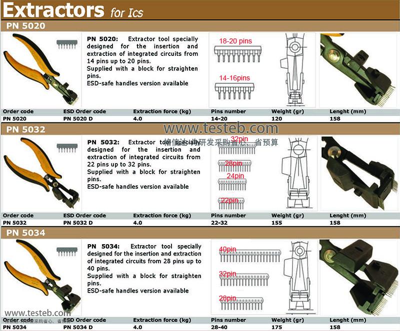 意大利Piergiacomi PN-5020起拔鉗用于夾取IC元件進(jìn)行插件安裝或者從PCB線路板拔取,鉗子夾緊閉合狀態(tài)下夾槽寬度6mm、長(zhǎng)度25mm,可插拔14-16pins及18-20pins插腳元件,另有PN-5032可處理22-32pin、PN-5034夾取28-40pin元器件。