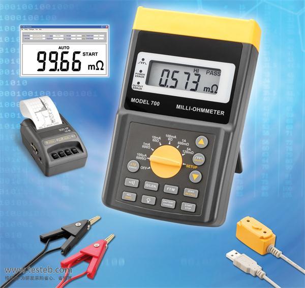 PROVA700毫歐表和PROVA 710微歐計采用四線式的量測法測量電阻最小分辨率1μΩ,準確度0.05%,電阻量程16mΩ到6KΩ共7個檔位,最大5A測試電流,710型號最大可達10A。Prova710毫歐微歐計可測試電感性的電阻,同時附帶電線長度量測功能。