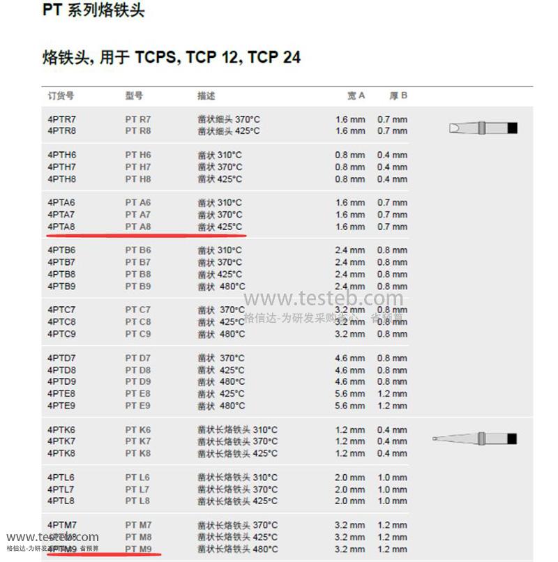 Weller威樂高端進口烙鐵頭PT系列4PTM9-1烙鐵頭適用50W磁控焊筆TCP 12、TCP 24焊筆,焊咀為鑿狀長烙鐵頭,溫度480℃。PTM9烙鐵頭SOLDERING TIP 3.2MM訂貨號T0054119999。如果需要其他尺寸的烙鐵頭用于TCP焊筆,請使用LT烙鐵頭和PT/LT連接頭。