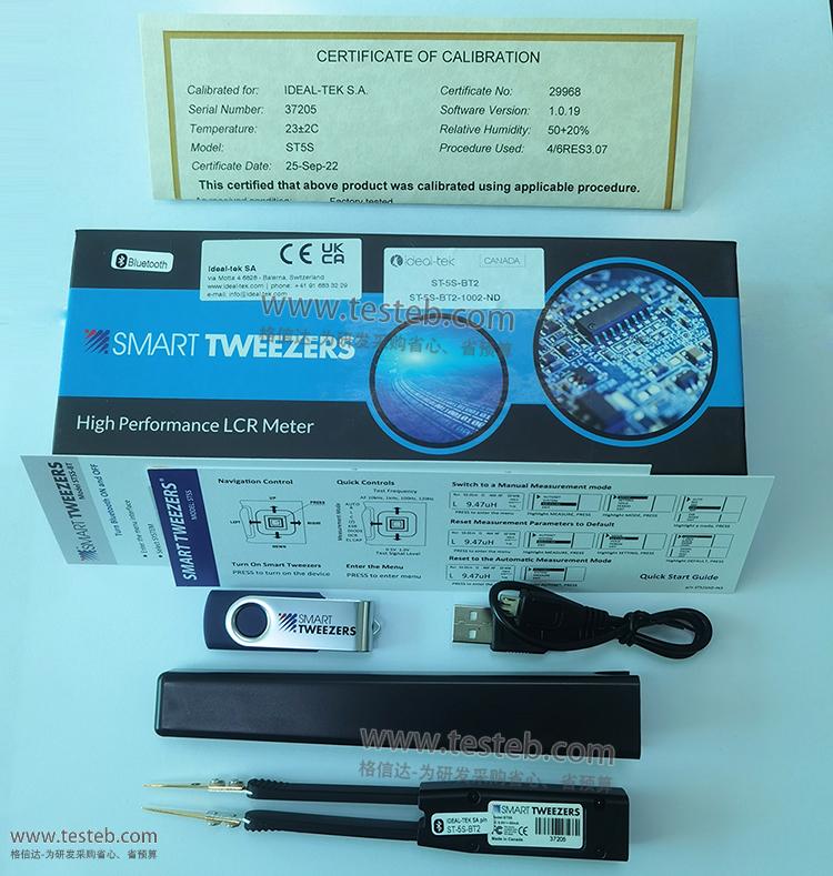 ideal-tek Smart Tweezers™ Colibri™ ST-5S測試鑷子標準款是原ST-5C(前身ST-5/ST-AE/ST-3i)停產替代升級型號,測試頻率1 kHz, 10 kHz, 120 Hz, 100 Hz,量程范圍L:0.5 uH~999 mH、C:0.5 pF~4999 μF、R:0.05 Ω~9.9 MΩ、Q:0.001~1000、耗散系數D范圍0.001至1000,典型電容電感精度0.5%、電阻精度電阻0.2%,測試信號電平0.25-1.0 Vrms,Swiss-made瑞士制造的精密尖頭。設計緊湊,輕便的電池供電的測試鑷子。ideal-tek Smart Tweezers ST-5S-BT2智能鑷子帶藍牙傳輸功能,可將數據實時傳輸顯示到iOS & Android移動設備;ST-LED用于測試和驗證SMD和通孔LED,可調恒定測試電流1-30mA、10 ms至1000毫秒可調節測試工作周期,自動LED極性檢測和顯示、視覺亮度及色彩驗證。