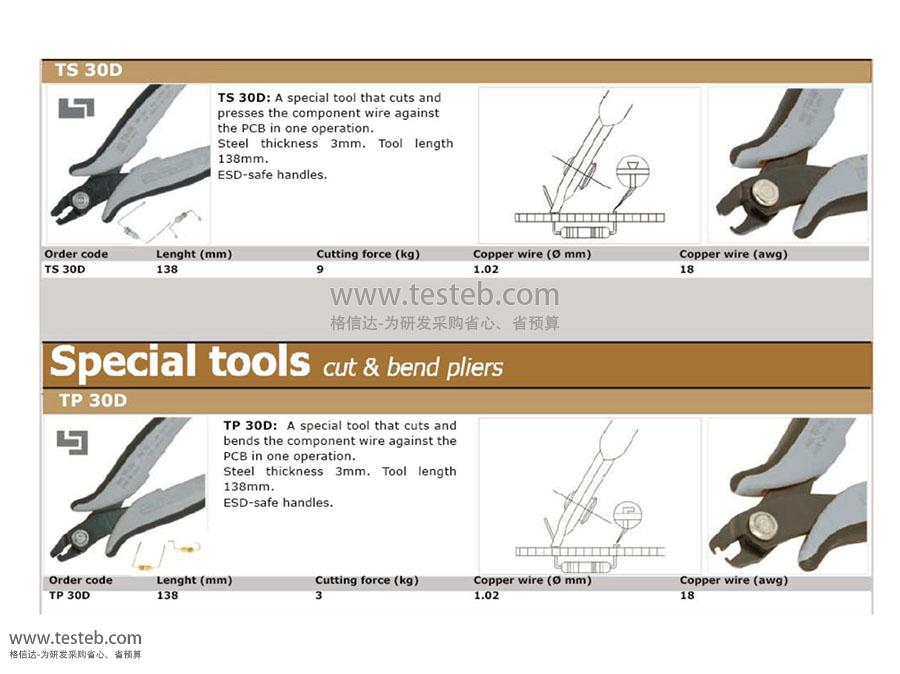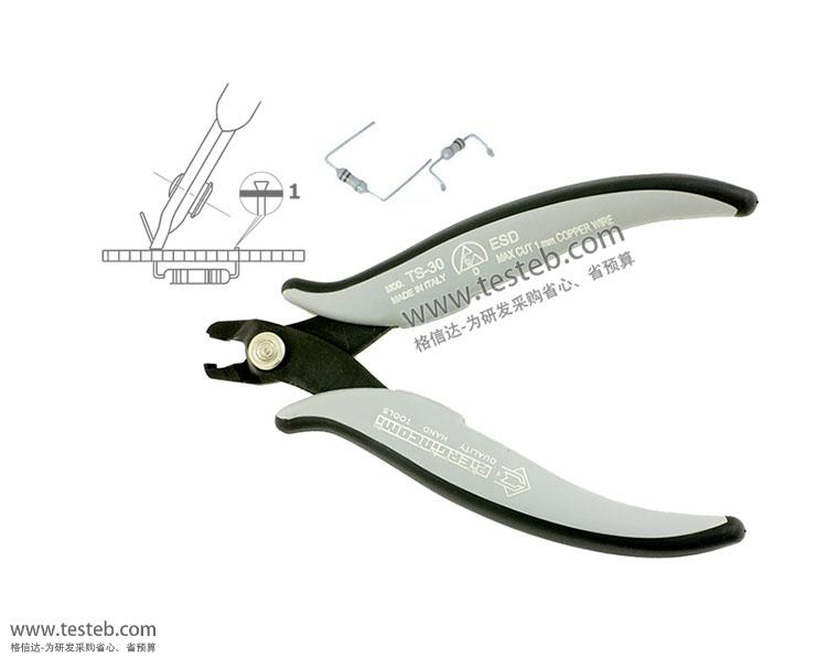 | TS 30壓切鉗 | 電阻、二極管 | 將PCB板引腳剪切并壓扁平緊貼在線路板上 | Φ1.02mm,18awg,9.0kg |