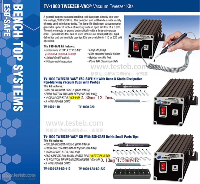 Virtual TWEEZER-VAC TV-1000-220電動真空吸筆機隔膜泵可產生10寸汞柱真空度,提供的吸力可吸取重量200g以內物體,標配2.38mm~12.7mm共9支常規吸筆頭丁腈橡膠材質吸盤靜電消散等級ESD且接觸表面無印痕,也可選購0.1mm~2mm微型吸筆頭,用于硅晶粒、裸die芯片、IC元件、玻璃吸取操作。