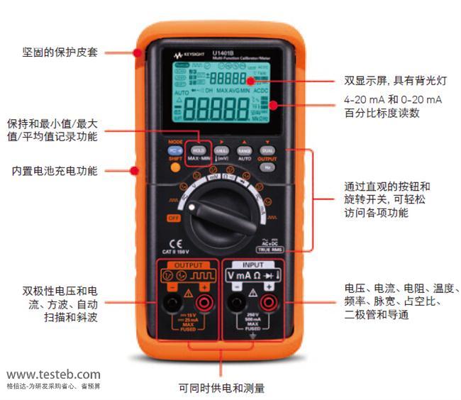 是德科技Keysight U1401B數字萬用表具有萬用表的測量功能,同時它也是一臺多功能校準儀,可以用作信號源校準過程控制部件,具有雙極電壓源和電流源、方波信號、自動SCAN和RAMP輸出功能,4-20mA信號校驗、可充電電池。