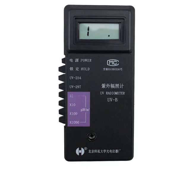北師大UV-B紫外輻照計波長范圍:單通道峰值254nm (230-290nm),雙通道峰值297nm (250-350nm)和254nm,輻照度測量范圍0.1~199900μW/cm2,適用于殺菌、光刻、水處理、醫療、育種等領域的紫外輻照度測量工作。