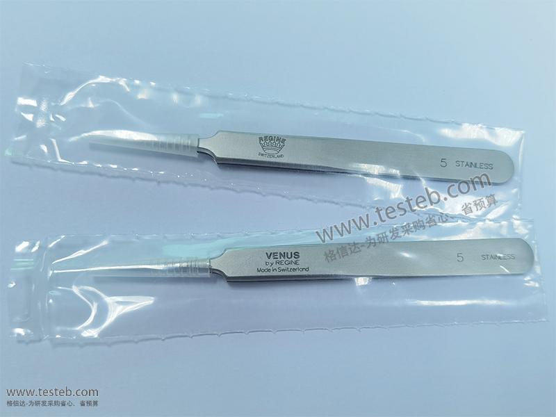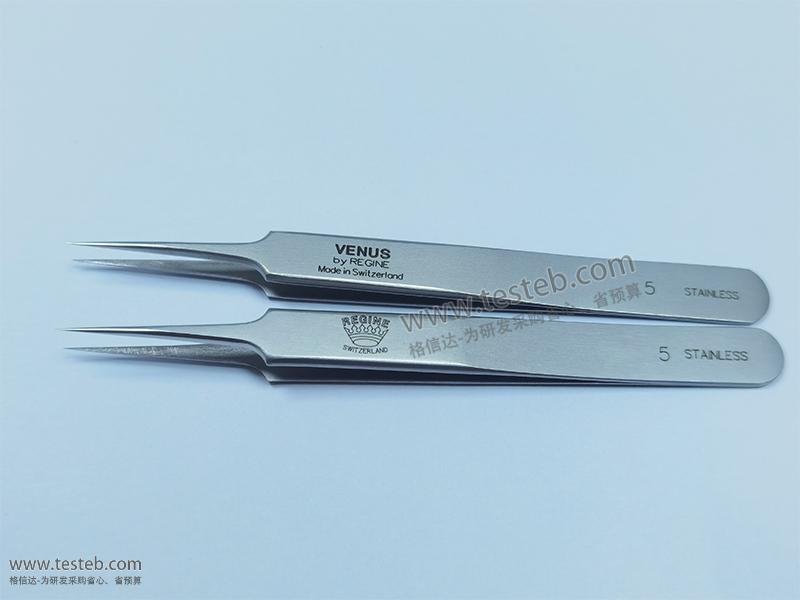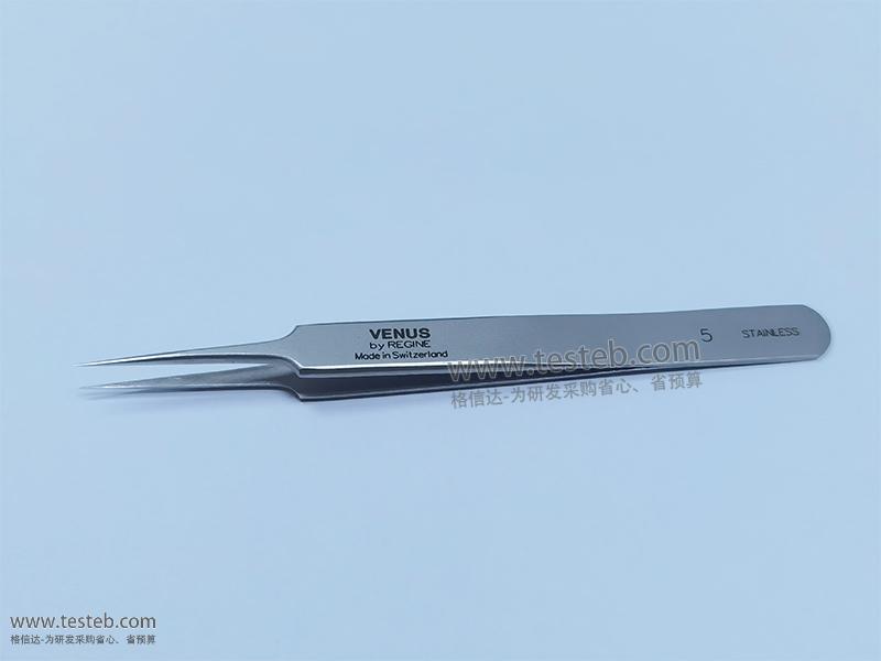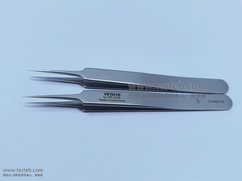 瑞士REGINE皇冠子品牌VENUS 5號鑷子STAINLESS材質型號代碼5-S(料號5-INOX),采用高碳不銹鋼材料具有59HRC高硬度,0.1mm精細尖頭堅實堅硬,適合溫和環境下高強度夾取,用于微電子夾芯片細線或者生物實驗細胞夾等,耐高溫300℃,全長110mm。