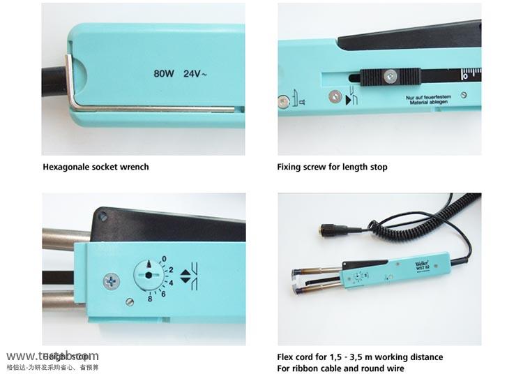 德國威樂WST20電熱剝線鉗即Weller WST82熱剝鉗通過80W焊臺主機數顯控制溫度50~450攝氏度,用精致鋒利的熱剝刀將塑絕緣材料剝掉,剝皮長度最長可調至30mm,提供各種刀頭,剝線直徑2.0mm、1.6mm、0.51mm、0.4 mm等。