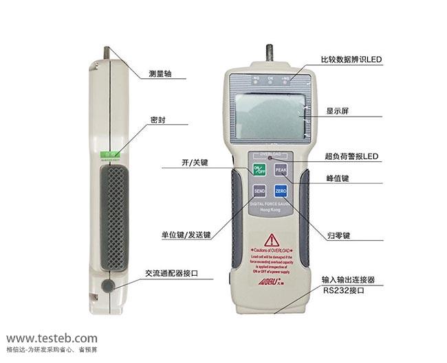 艾固ZP-100推拉力計用于測試推力及拉力,量程100N、分辨率0.01N,數字顯示及存儲,具有峰值保持功能,可切換N制牛頓、重量kg公斤、Lb磅三種計測單位,適用于電子電器、輕工紡織、動力機械、科研機構等推拉負荷及材料強度測試。