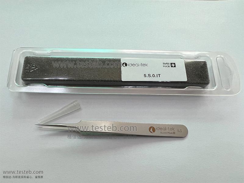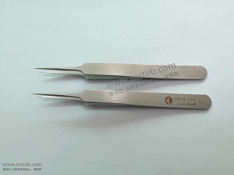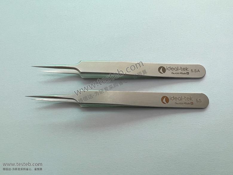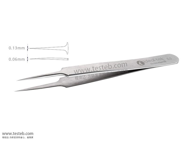 ideal-tek 5.S鑷子5號造型款式,高精密尖頭寬度0.13mmx0.06mm厚度,Stainless Steel (S)高碳鋼不銹鋼材質也即INOX鋼,耐腐蝕性低于SA低碳奧氏體鋼,但有更高硬度59HRC,適合高強度溫和環境下操作,耐溫300℃、輕微磁性可磁化,用于需要牢固夾住精細零件同時具有良好可見性,堅硬尖頭不易彎曲。